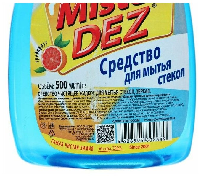 Mister DEZ Средство для мытья стёкол и зеркал Mister Dez, грейпфрут, без распылителя, 500 мл