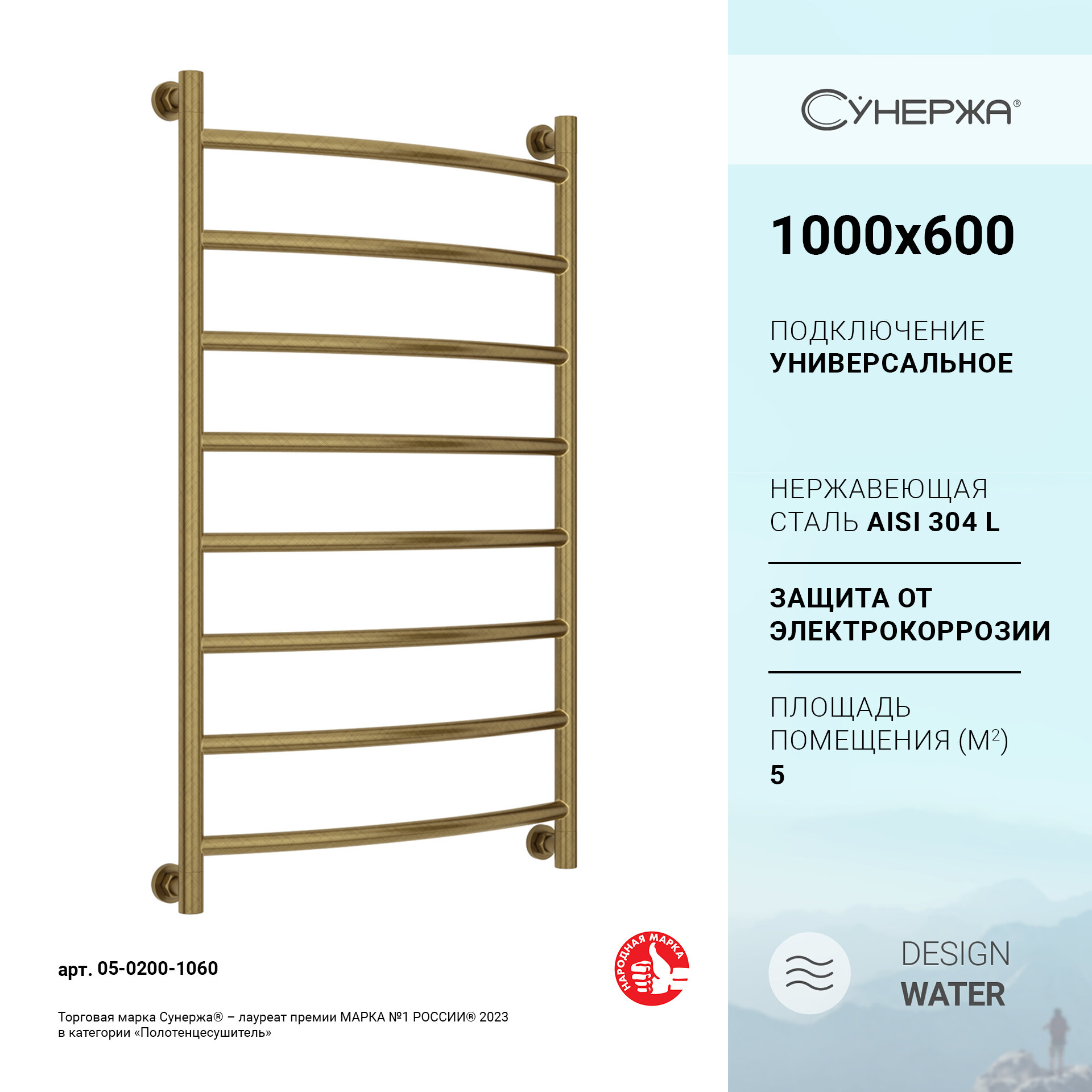 Водяной полотенцесушитель Сунержа Галант+ 1000x600 золото