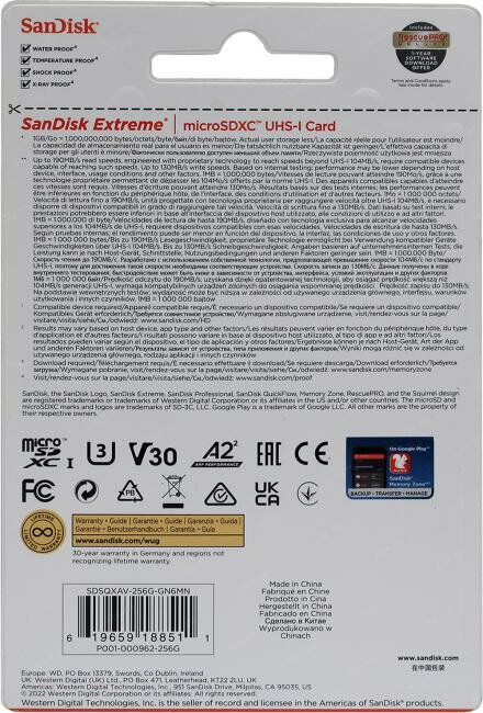 Карта памяти 256Gb - SanDisk Extreme Micro Secure Digital XC Class 10 UHS-I A2 V30 U3 SDSQXAV-256G-GN6MN