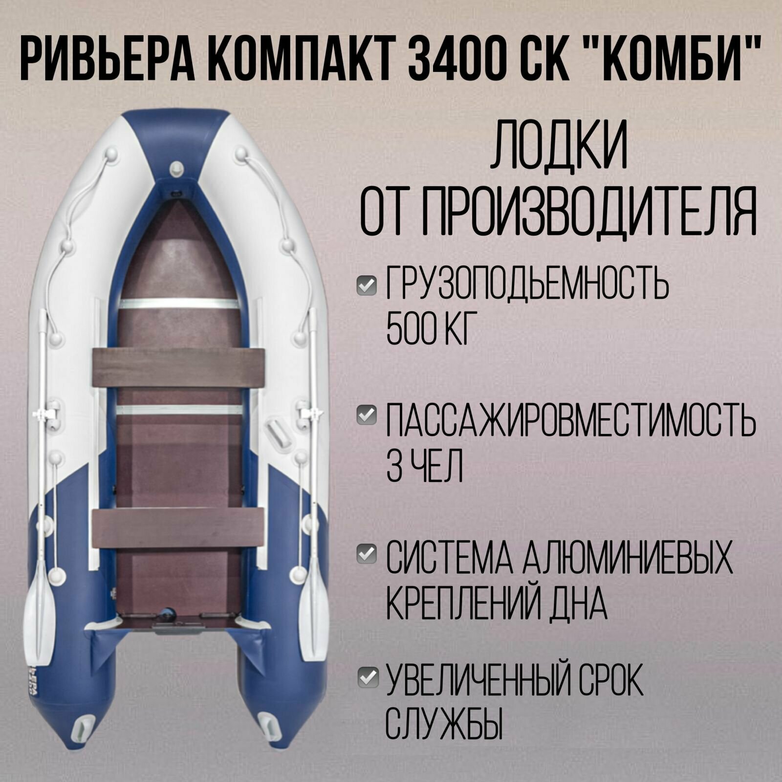 Надувная лодка ПВХ Ривьера Компакт 3400 СК "Комби" под мотор, слань+киль в комплекте
