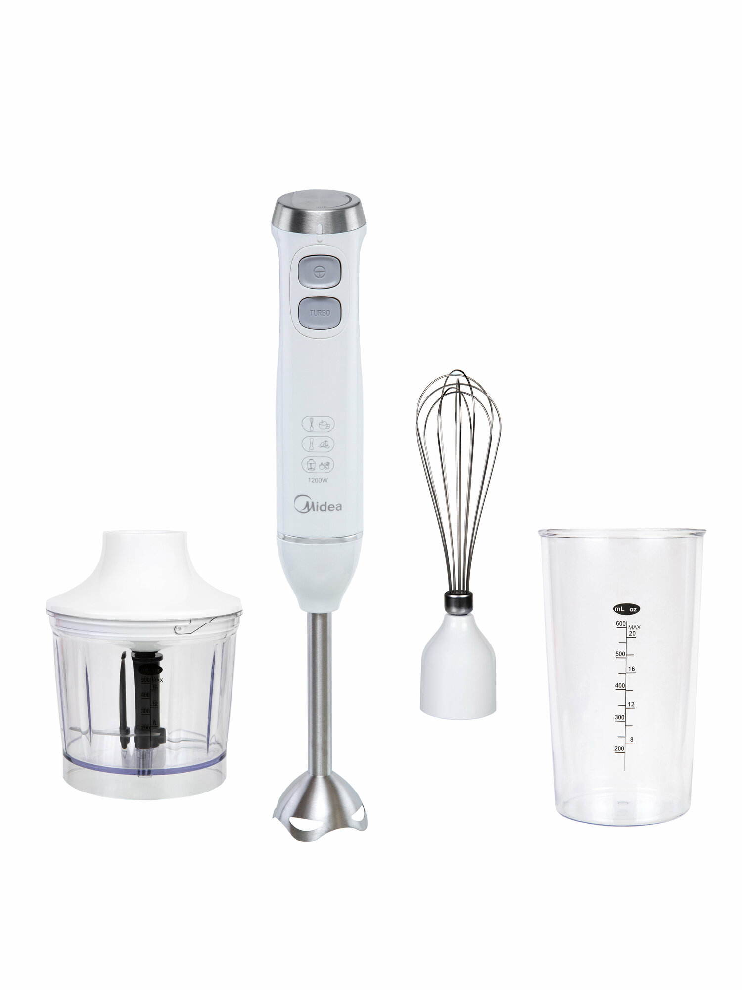 Блендер погружной Midea MC-BL301, 1200 Вт, 4 в 1, чаша 0,6 л, 3 насадки, турборежим, белый