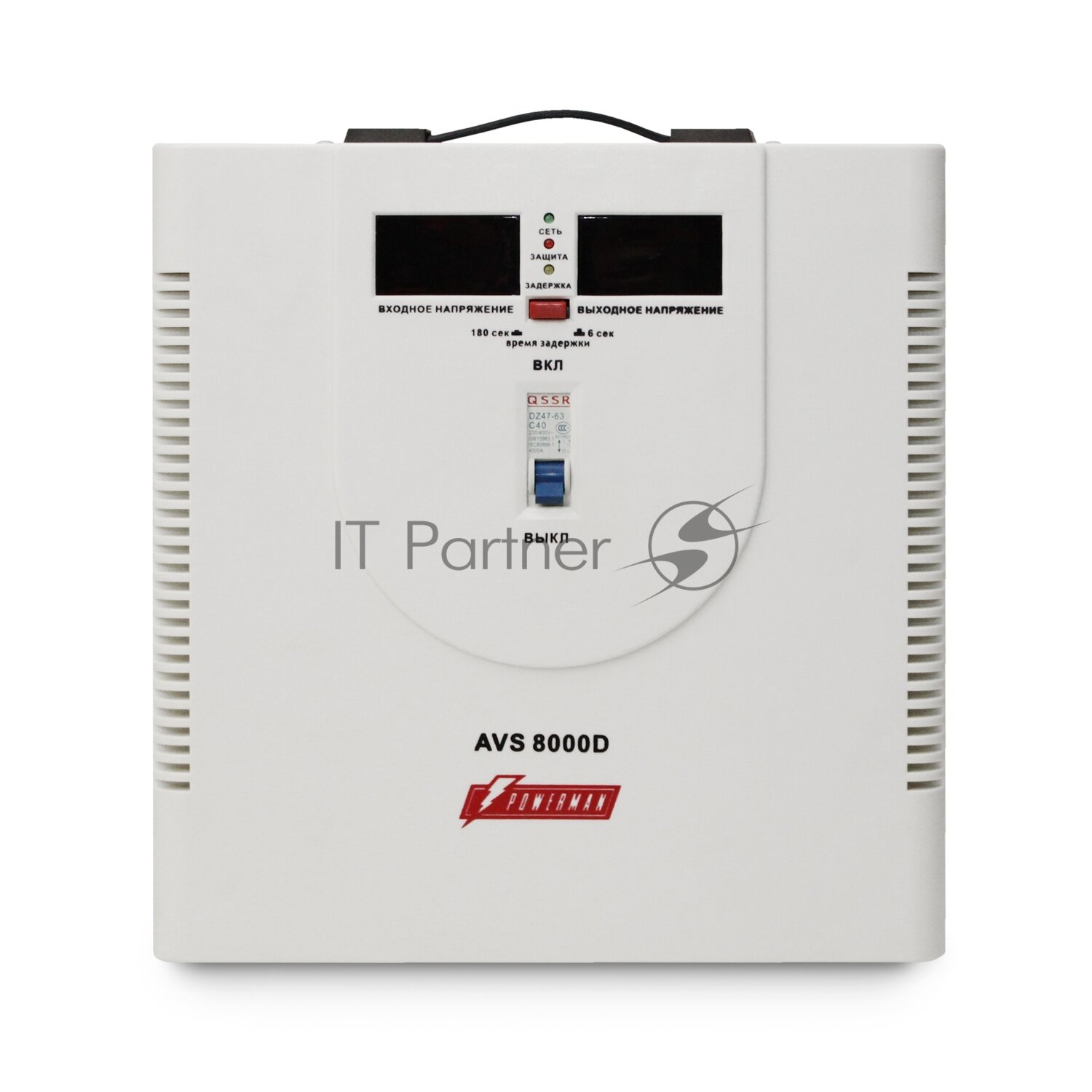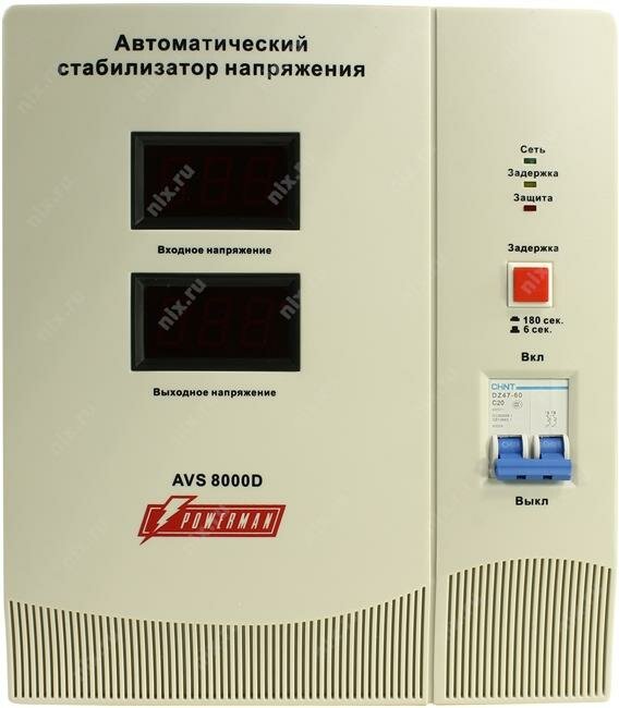 Стабилизатор POWERMAN AVS 8000D, ступенчатый регулятор, цифровые индикаторы уровней напряжения, 8000ВА, 140-260В, максимальный