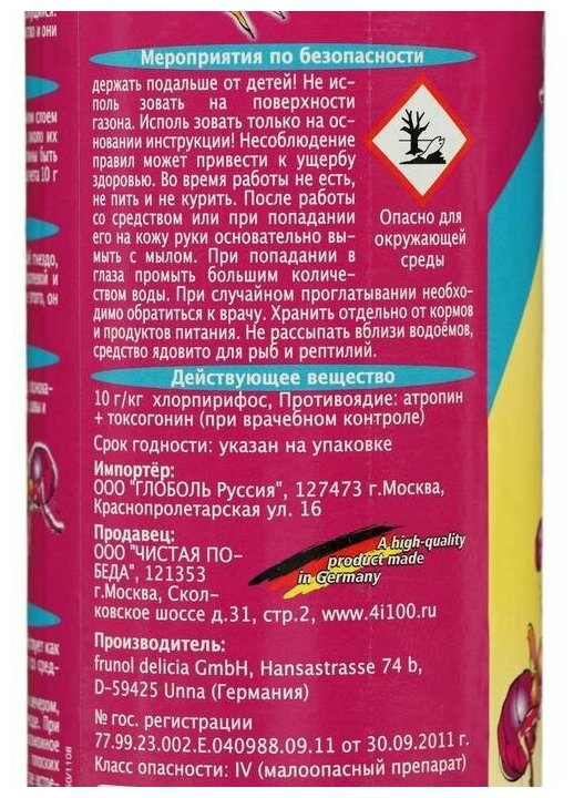 | Плюсы: | Реально работающее средство. Победили муравьев на даче. |