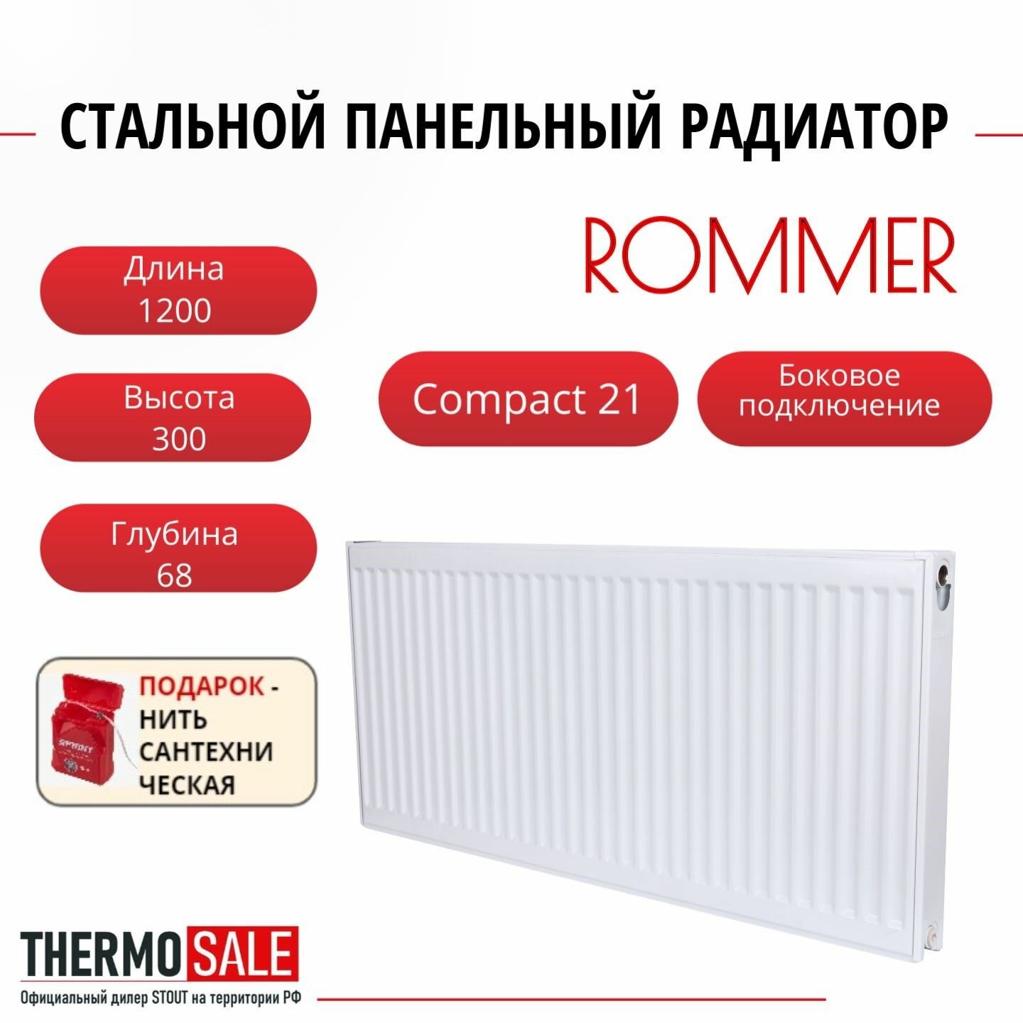Радиатор стальной панельный ROMMER 300х1200 боковое подключение Compact 21/300/1200 Нить сантехническая