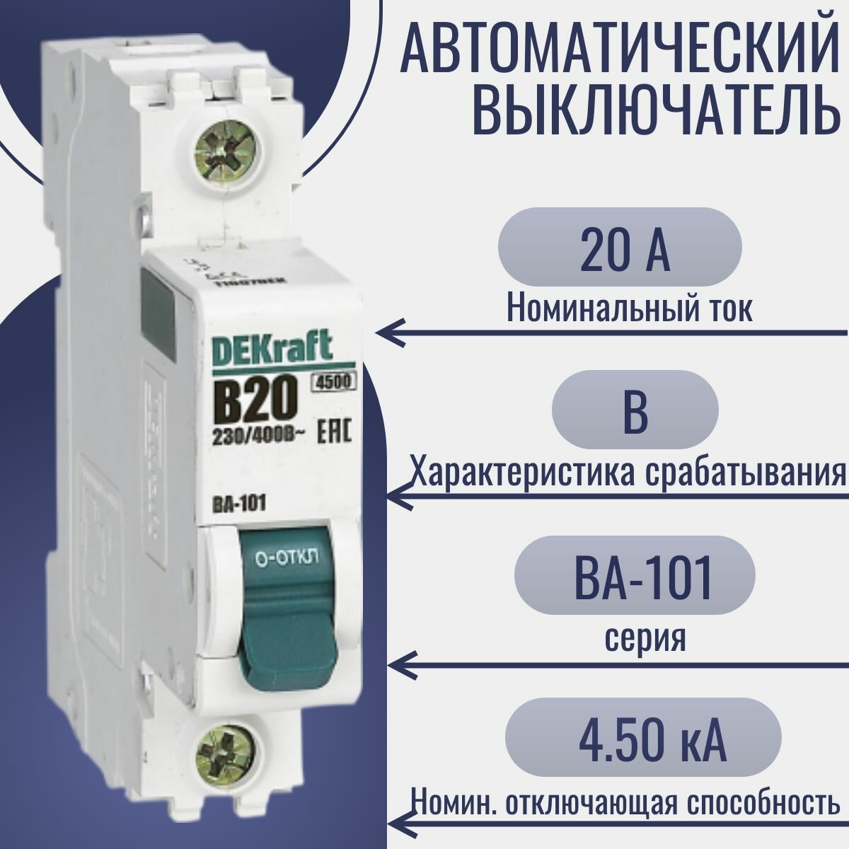 Ниже Вы можете прочитать отзывы на DEKraft Автоматический выключатель 1Р 20А х-ка B ВА-101 4,5кА, ознакомится с подробными характеристиками, посмотреть интересные обзоры и фотографии на DEKraft Автоматический выключатель 1Р 20А х-ка B ВА-101 4,5кА.