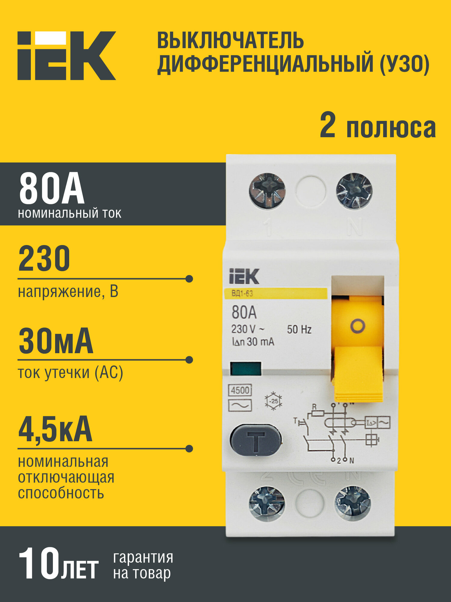 Выключатель дифференциального тока (УЗО) 2п 80А 30мА тип AC ВД1-63, IEK MDV10-2-080-030 (1 шт.)