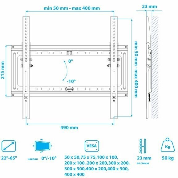 Кронштейн настенный Kromax IDEAL-4 22-65 (наклон -10/0, вылет 23 мм, до 50кг, черный)