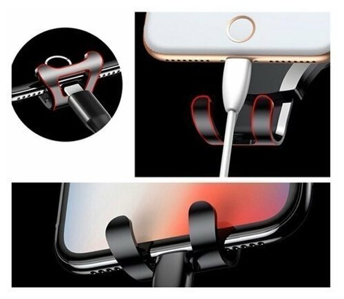Интересная система удержания: боковые "лапки" сжимают телефон под действием веса телефона на нижнюю "полочку". Таким образом, регулировать ширину нет надобности. В самой "полочке" проем для провода зарядки. |