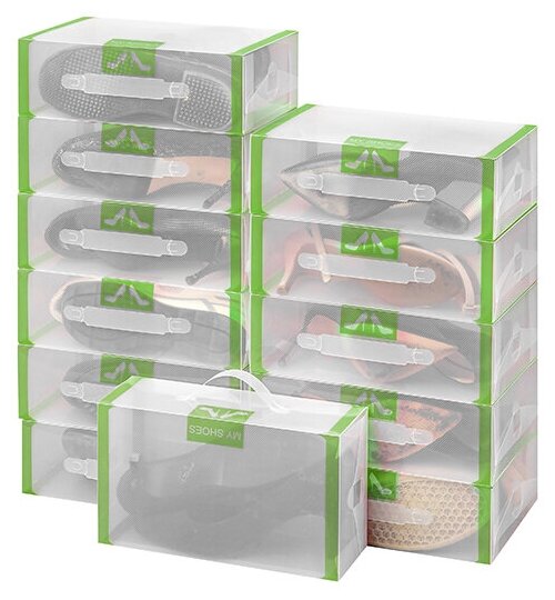 Набор 12 коробок для хранения женской обуви 30х18х10 см EL Casa Салатовая кайма, складные, с ручкой