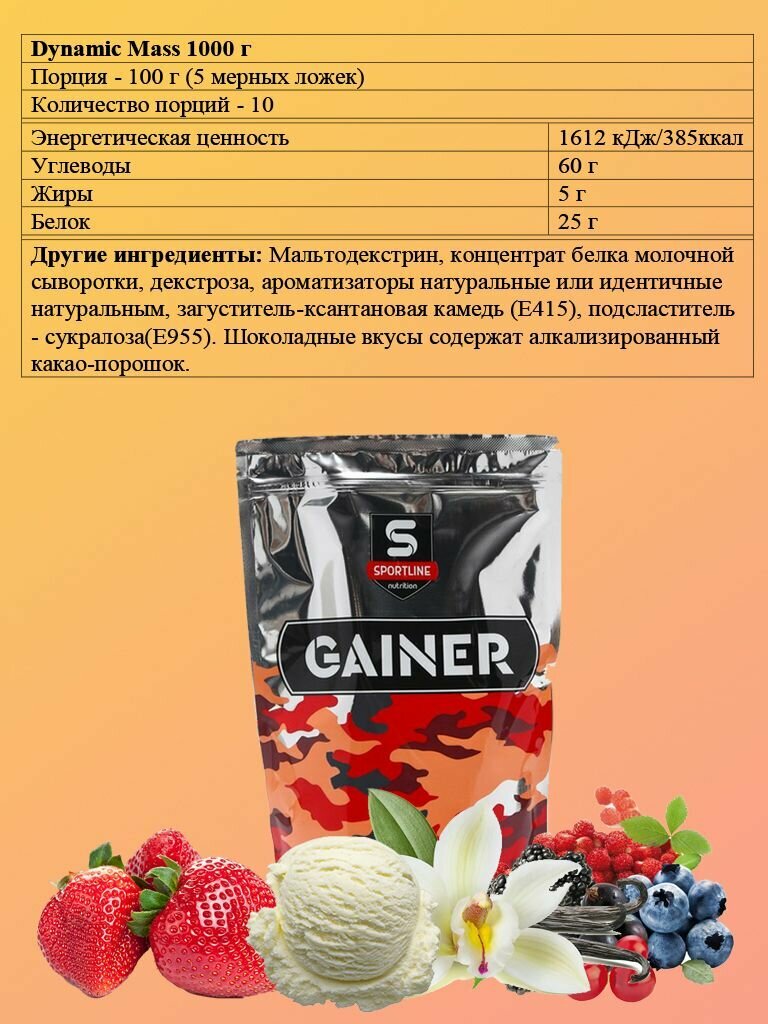 СохранитьГейнер SportLine Nutrition Dynamic Mass Powder, ваниль, 1000 гр. интересное: