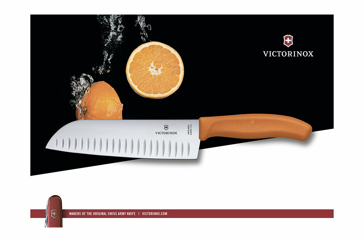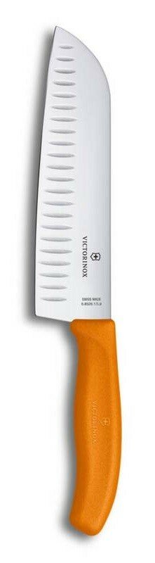 Нож Santoku VICTORINOX Swiss Classic, рифлёное лезвие 17 см, оранжевый, в блистере 6.8526.17L9B