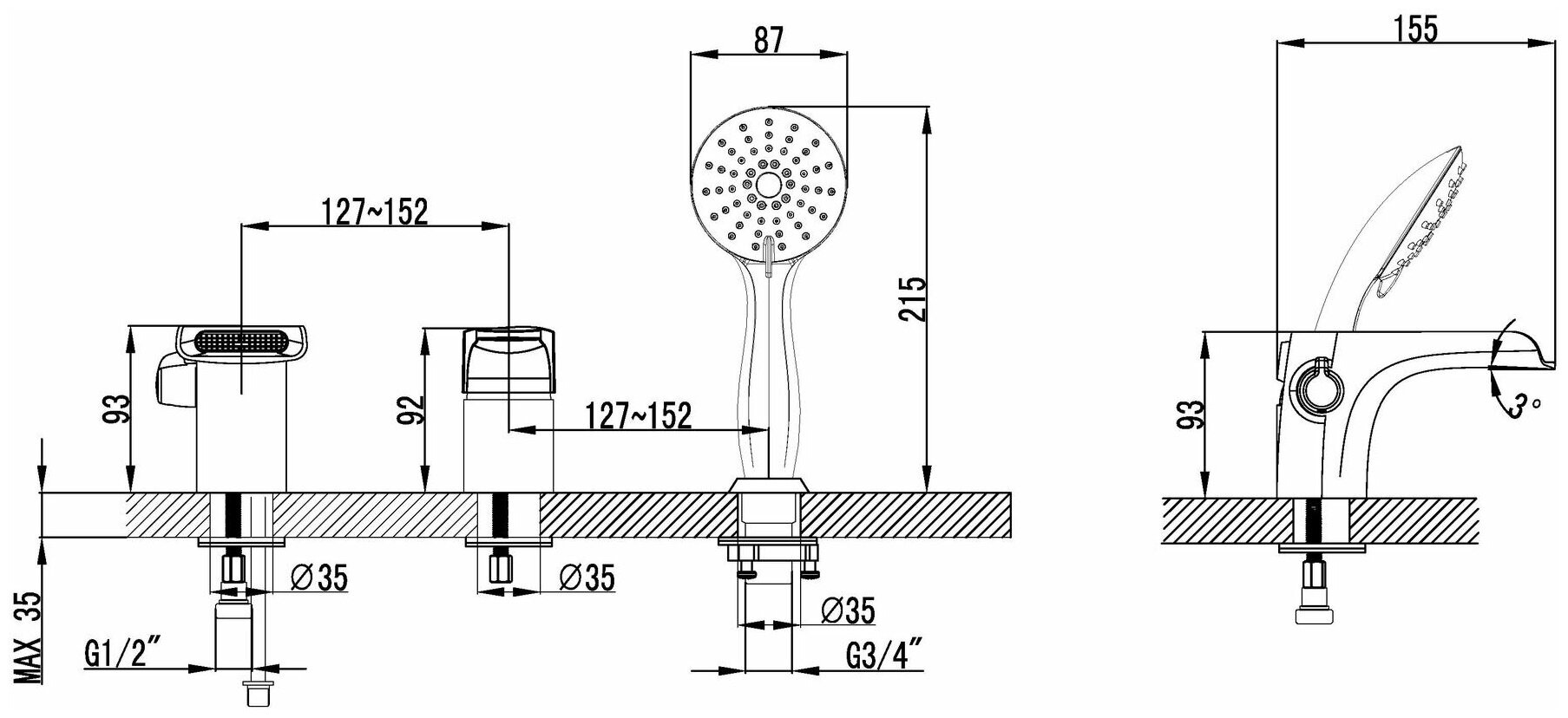 4345C Шифт Смеситель для ванны встраиваемый, на 3 отверстия, с аксессуарами, хром LEMARK