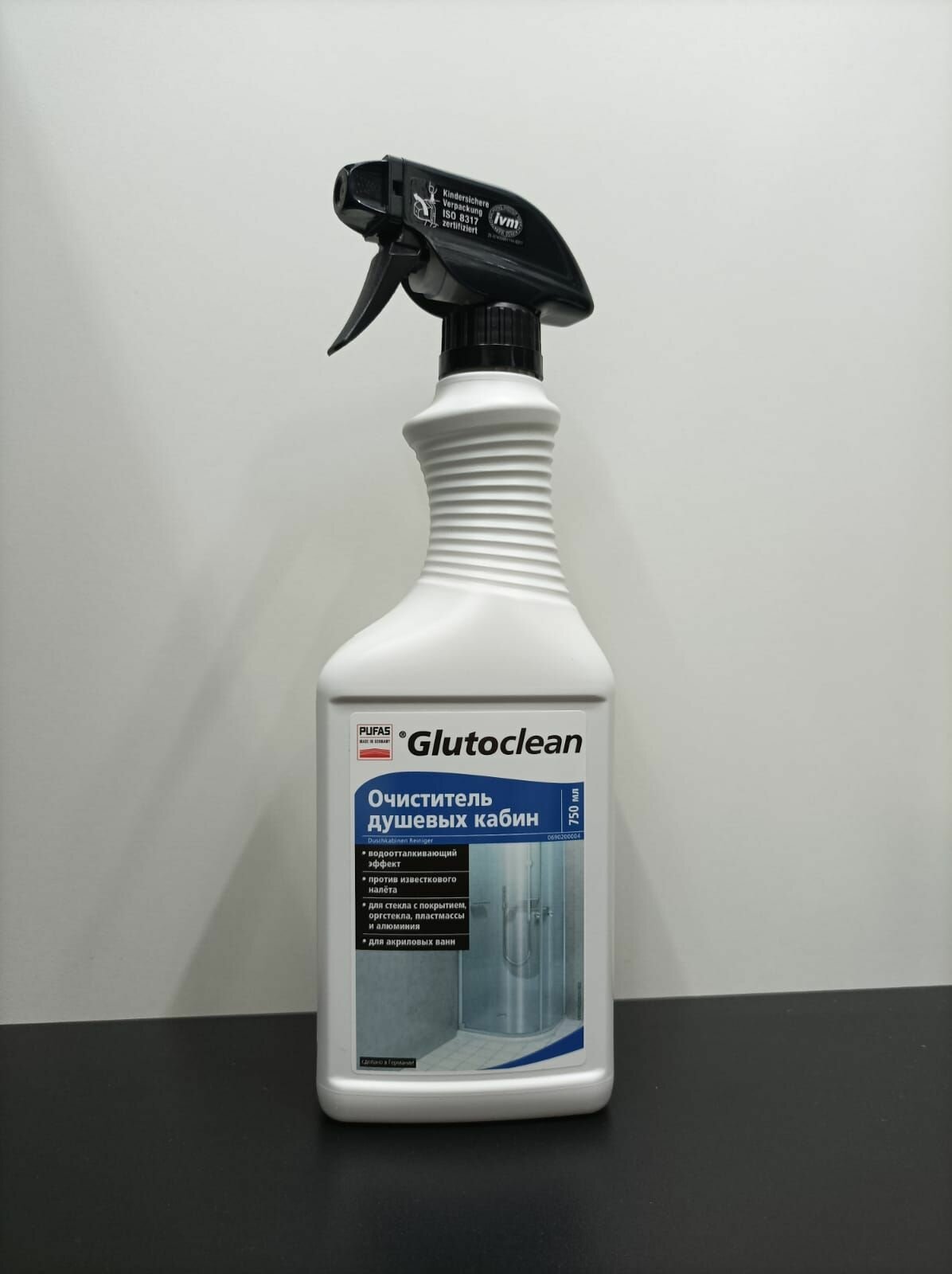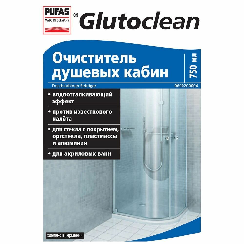 Очиститель для душевых кабин, Pufas Glutoclean, 750 мл.для удаления известковых и мыльных налетов на облицовочной плитке, швах между плиткой, стеклянных разделительных стенах и душевых занавесках.