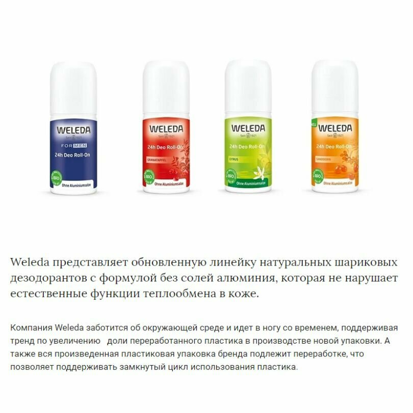 Weleda Дезодорант Roll-On Granatapfel Гранатовый роликовый с эфирными маслами 24 часа 50мл / естественная свежесть, надежная защита от пота и неприятного запаха, шариковый женский мужской.