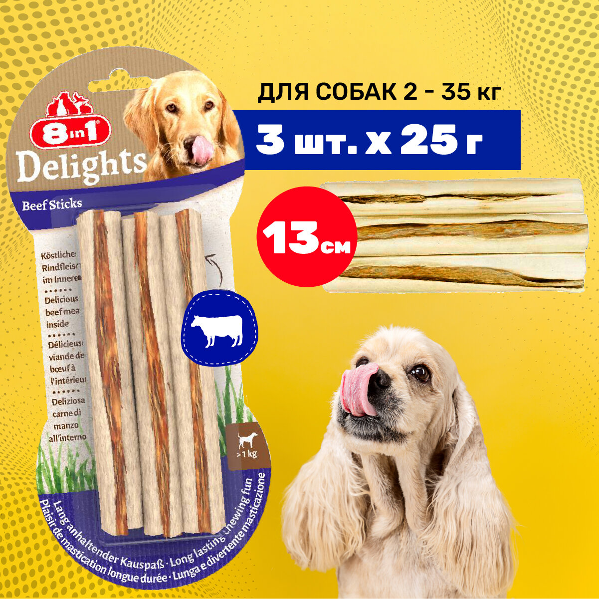 Лакомство 8 IN 1 DELIGHTS BEEF для собак маленьких и средних пород палочки с говядиной 13 см 3 шт (1 шт)