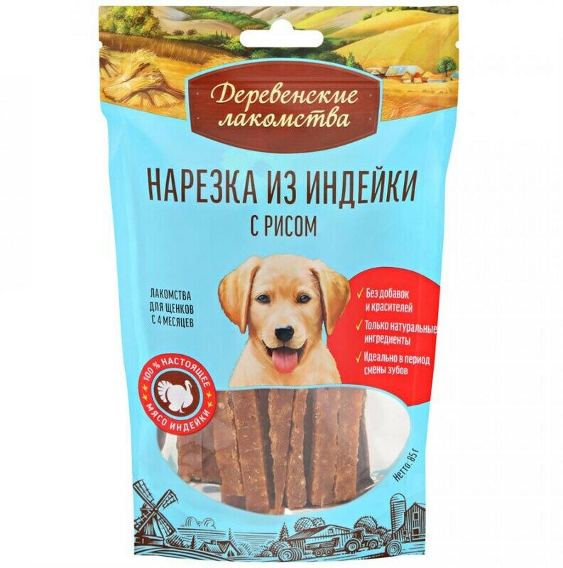 Лакомство Деревенские Лакомства мясная нарезка из индейки с рисом для щенков 85 г