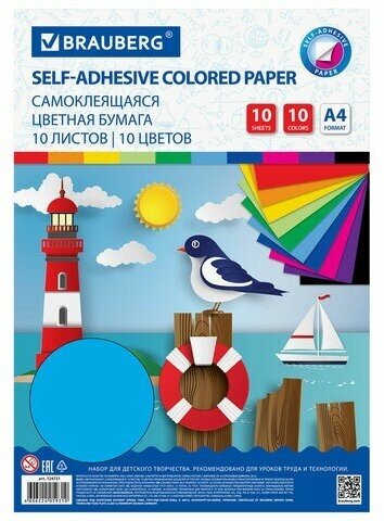 Цветная бумага Brauberg А4 самоклеящаяся мелованная, 10 цветов, 210х297 мм (124721)