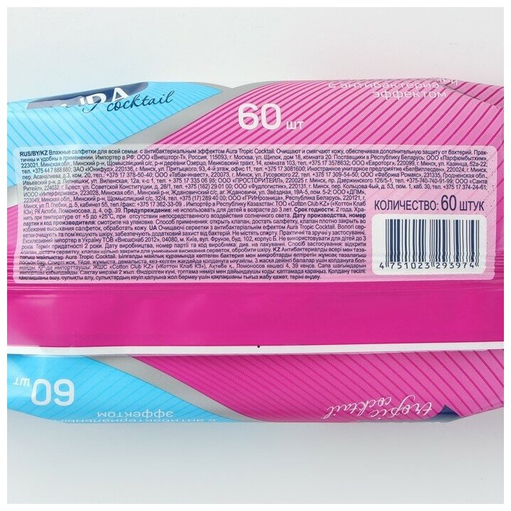 Влажные салфетки универсальные AURA Tropic cocktail 60шт с антибактериальным эффектом (2 дизайна)