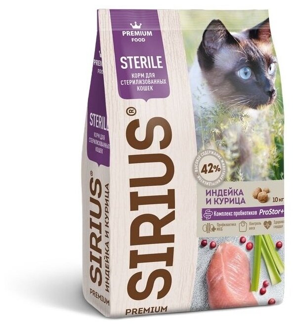 SIRIUS/Полнорационный сухой PREMIUM корм для стерилизованных кошек, Индейка и курица, 10 кг