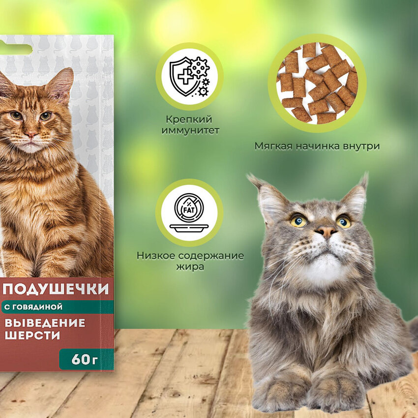 Мнямс хрустящие подушечки для кошек с говядиной Выведение шерсти 60 г NEW, 707933 (1 шт)