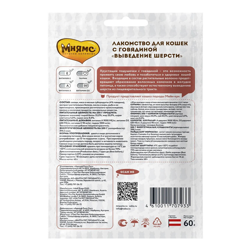 Мнямс хрустящие подушечки для кошек с говядиной Выведение шерсти 60 г NEW