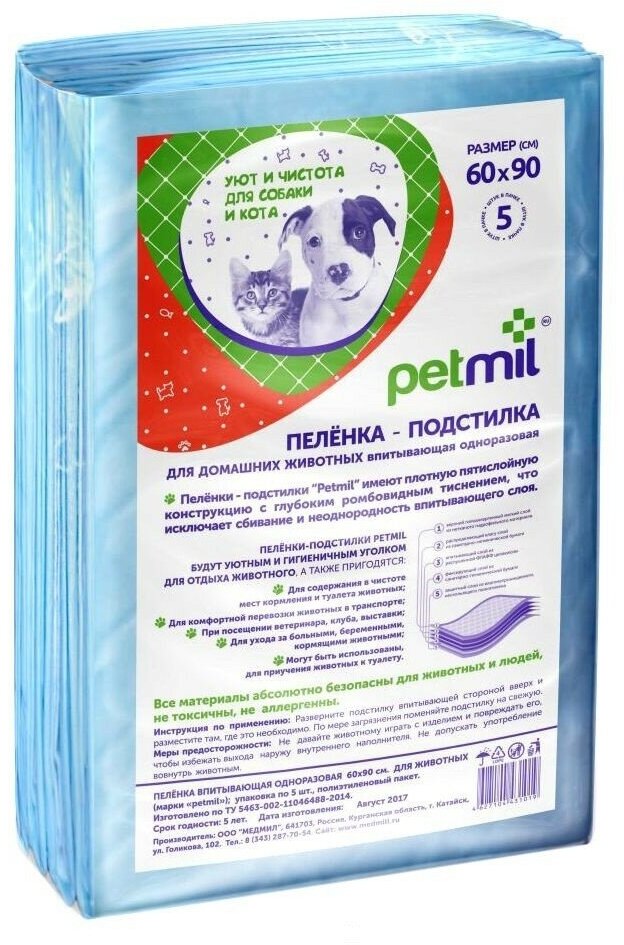 Пеленки Petmil впитывающая одноразовая 60*90*5шт / 1 шт