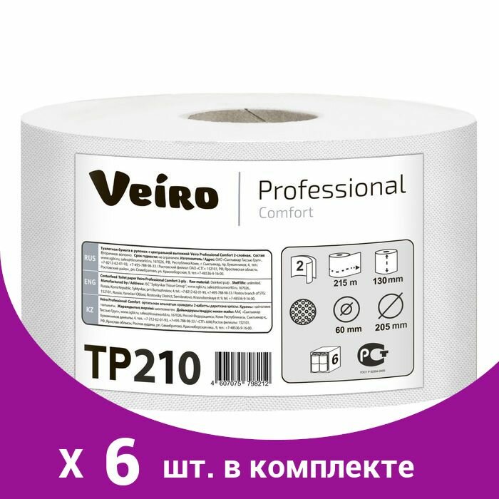 TP210 Туалетная бумага в средних рулонах с центральной вытяжкой Veiro Professional Comfort двухслойная (6 рул х 215 м)