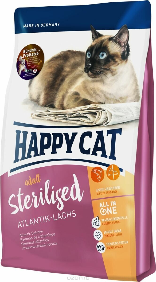 Happy cat Sterilised корм для взрослых кастрированных кошек и котов, с атлантическим лососем