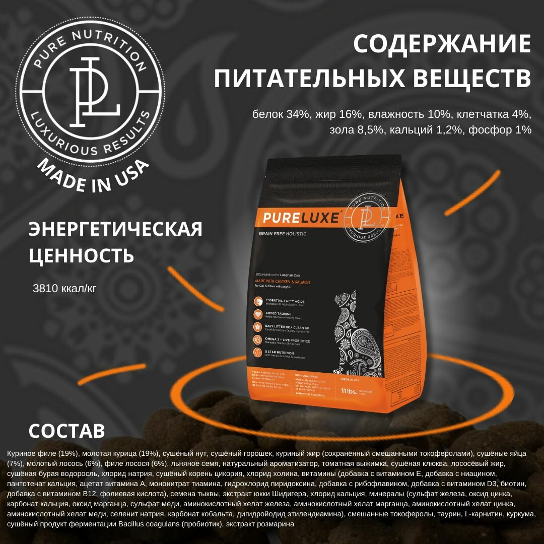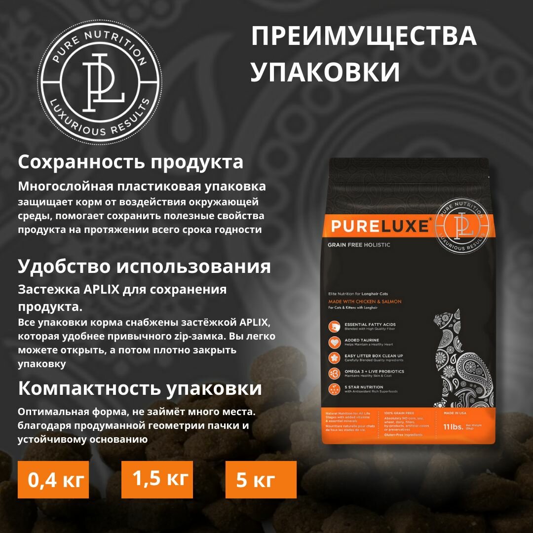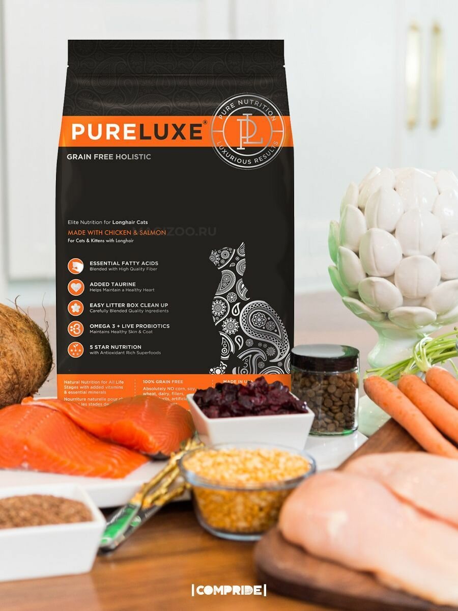Купить PURELUXE элитное питание беззерновой для длинношерстных взрослых кошек с курицей и лососем (5 кг)