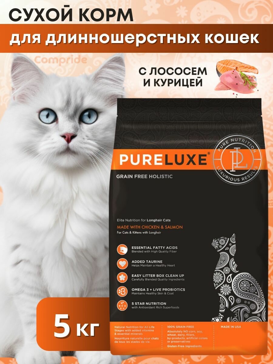 Сухой корм для кошек PureLuxe Пурлюкс беззерновой корм класса холистик для кошек и котят с длинной шерстью со свежей курицей и лососем 5кг