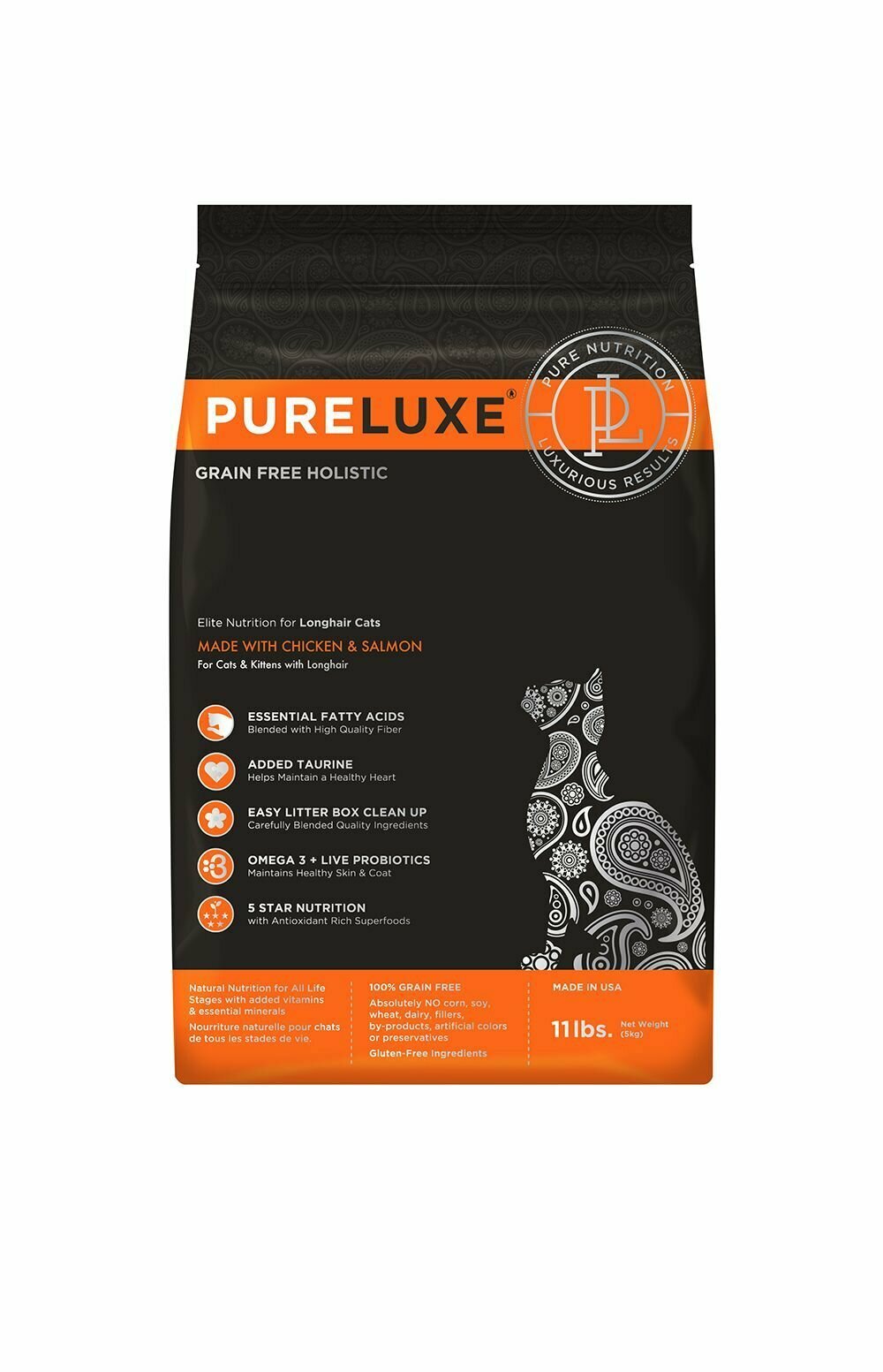 PURELUXE элитное питание беззерновой для длинношерстных взрослых кошек с курицей и лососем (1,5 кг)