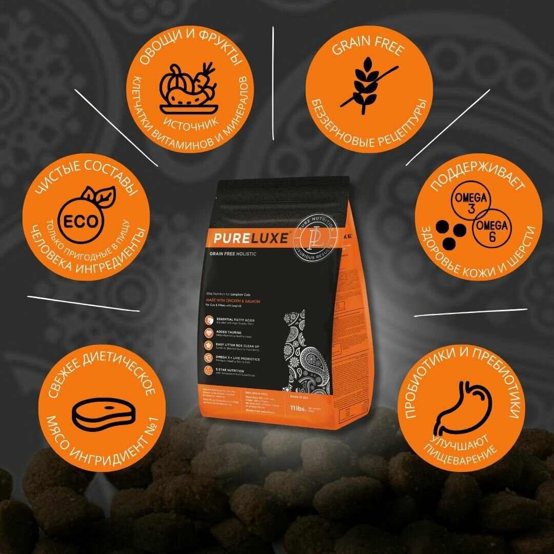 Сухой беззерновой корм PureLuxe Пурлюкс класса холистик для кошек и котят с длинной шерстью со свежей курицей и лососем , 5 кг.