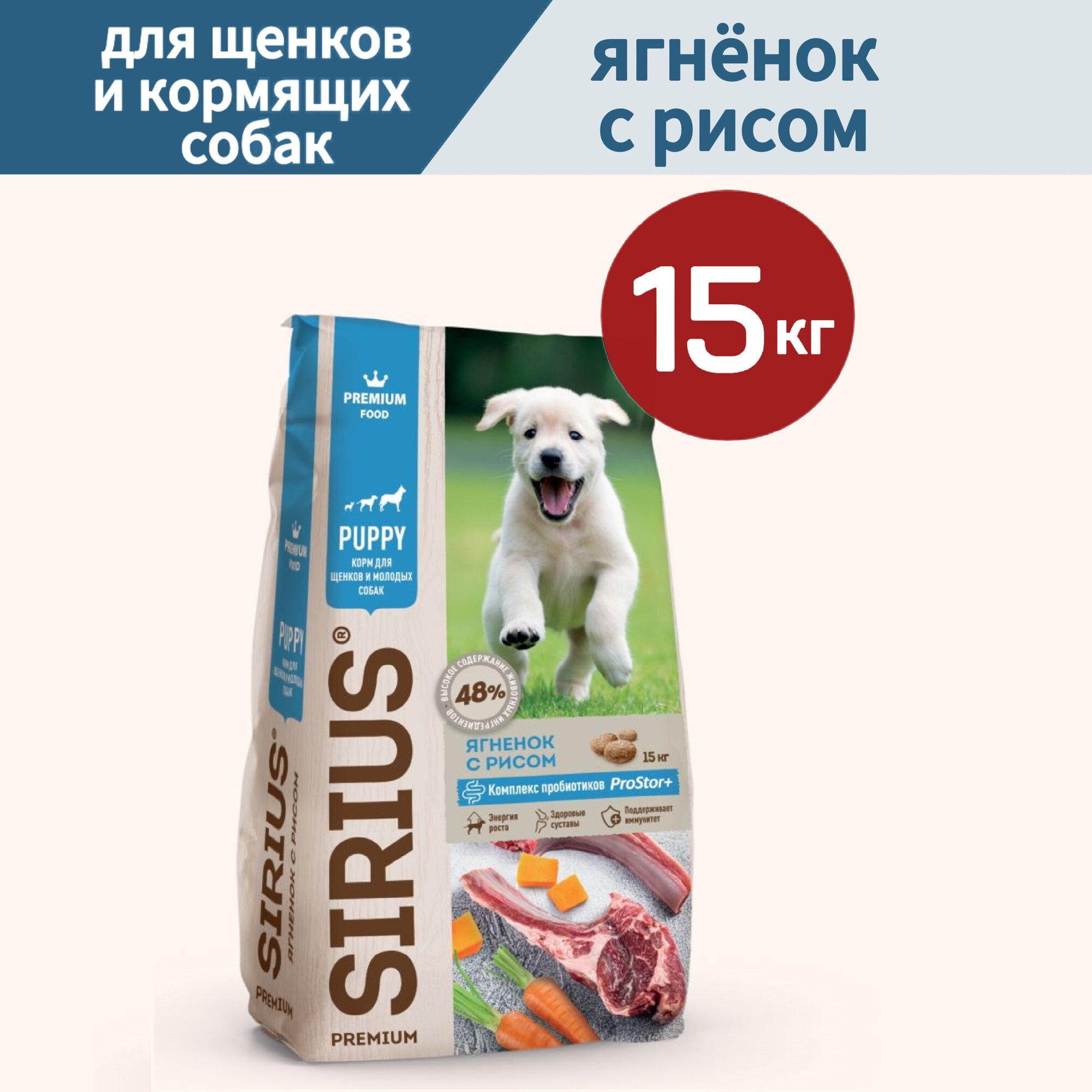 Корм сухой для собак SIRIUS 15кг для щенков и молодых собак, ягненок и рис, сириус