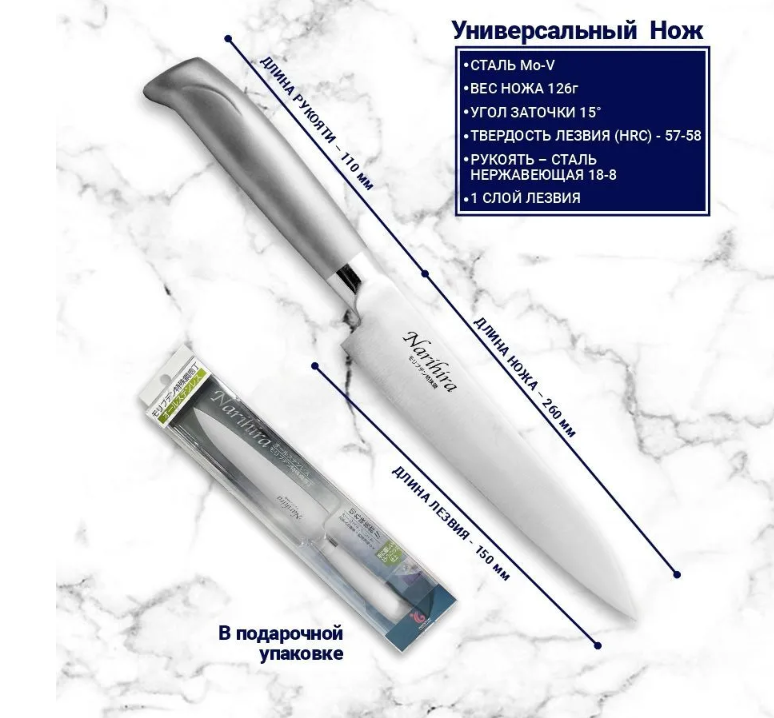| Отзыв: | полностью универсальный, металическая рукоять, все переходы плавные, мыть удобно, резать тем более |