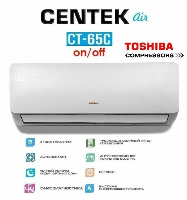 Сплит система CENTEK CT-65C07 (20 кв.м) Кондиционер Centek серия C on/of Компрессор Toshiba Скрытый LED дисплей Пульт ДУ с подсветкой