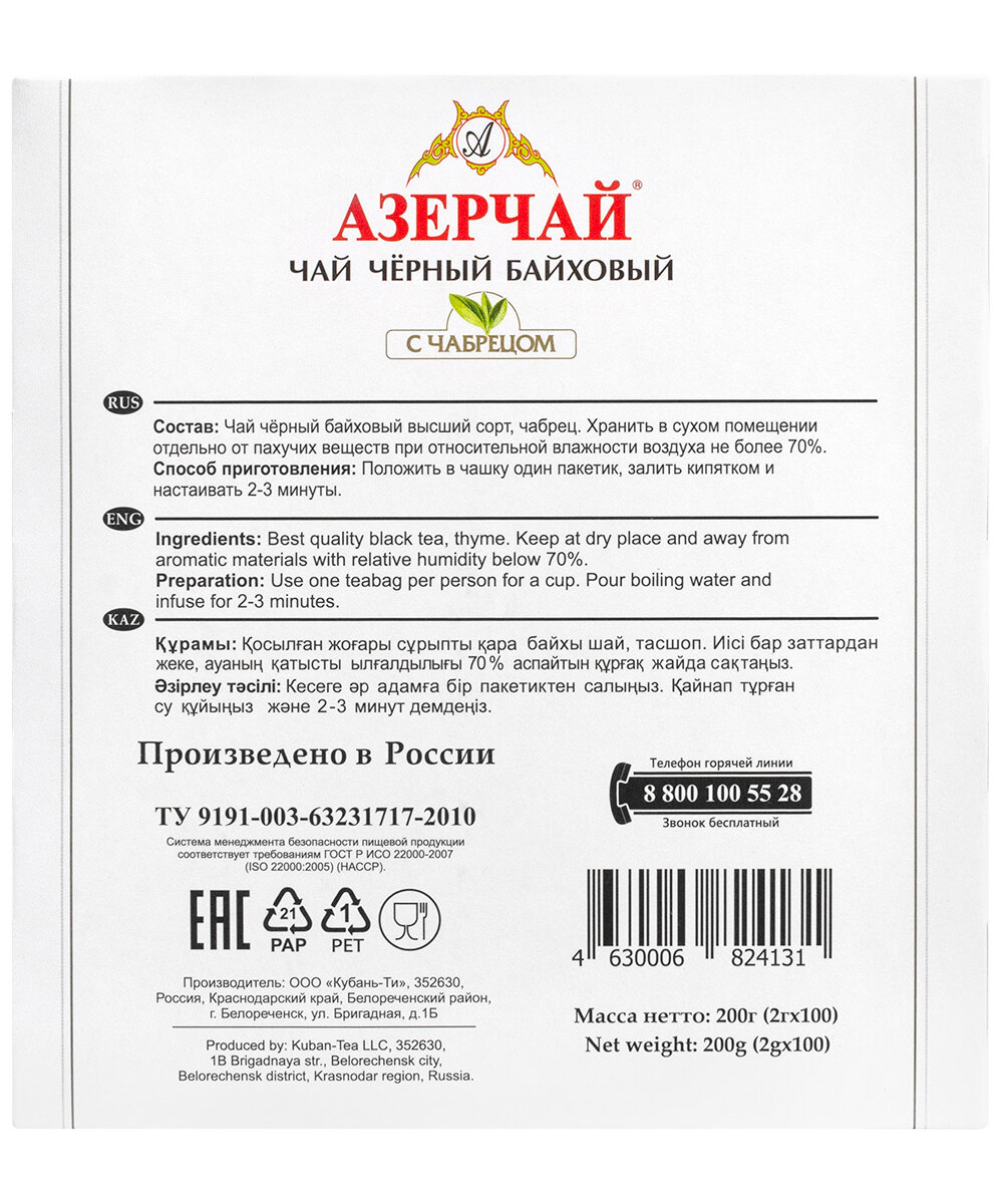 СохранитьЧай черный байховый Азерчай с чабрецом, в пакетиках, 100 пак. интересное: