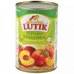 Персики Lutik консервированные очищенные половинкам в сиропе, жестяная банка, 425мл