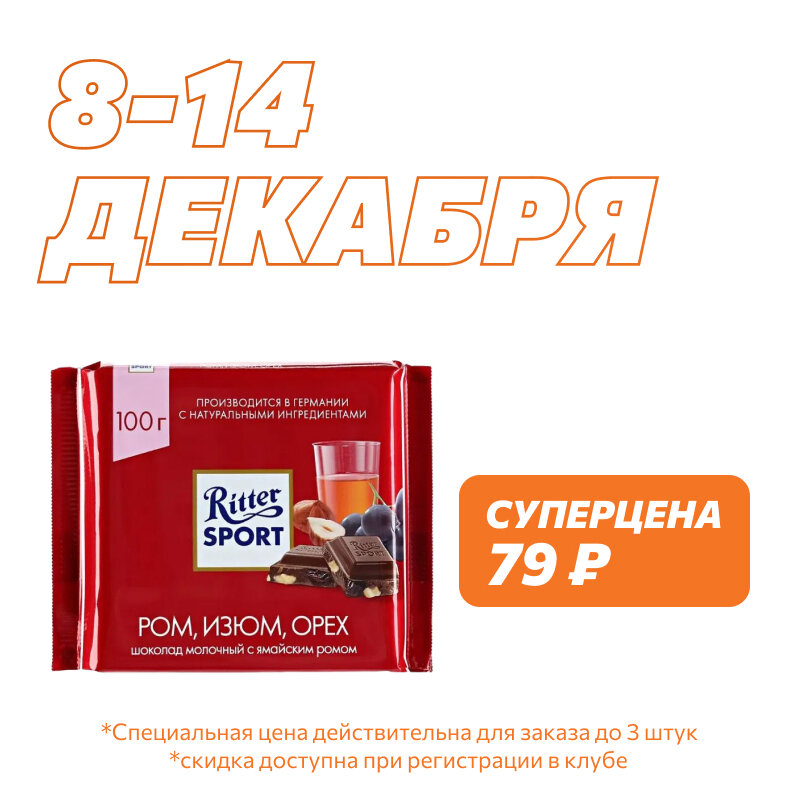 Шоколад молочный Ritter Sport "Ром, Орех, Изюм", 100 г х 12 шт