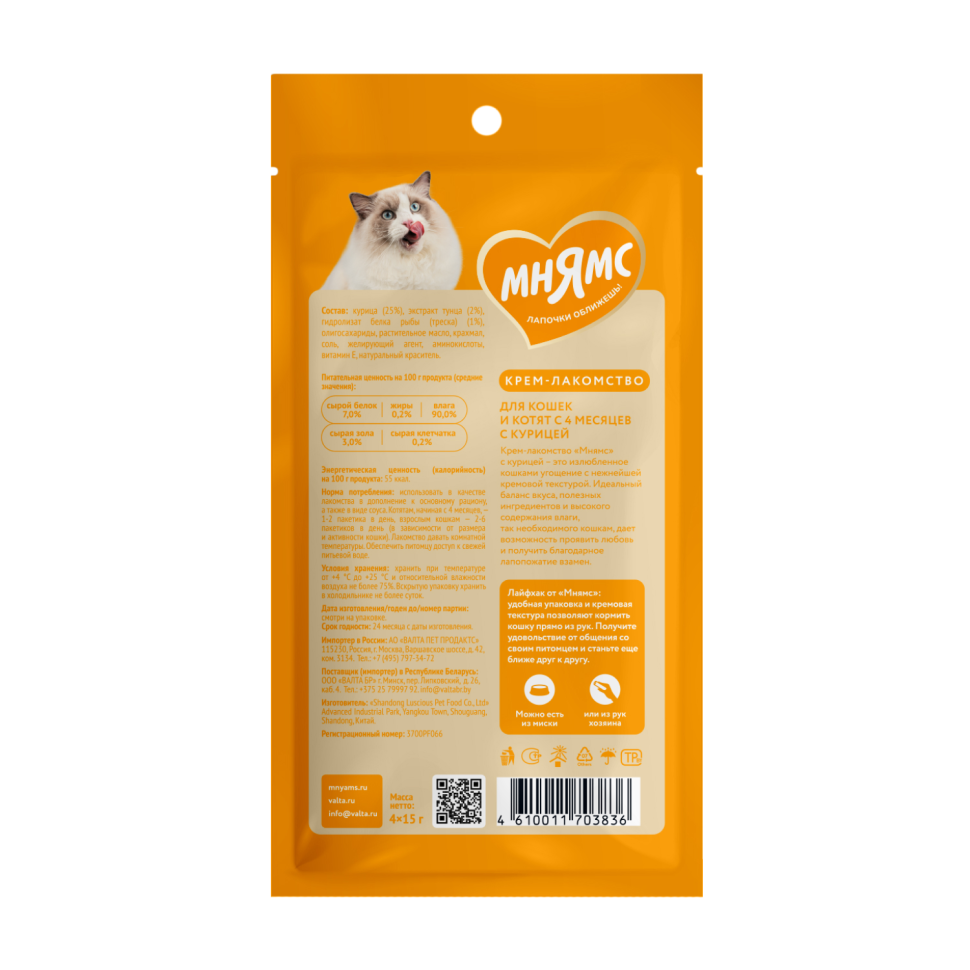 Мнямс Крем-лакомство для кошек с курицей, 15 г х 4 шт, 1 упак
