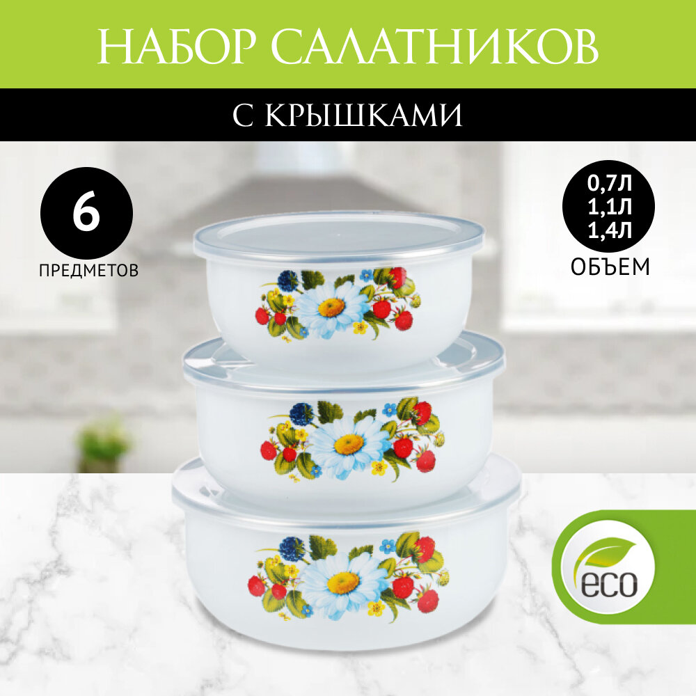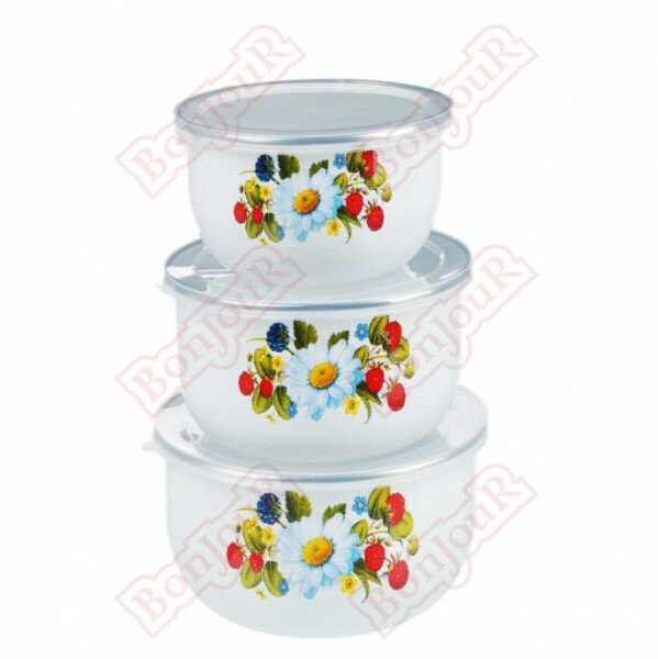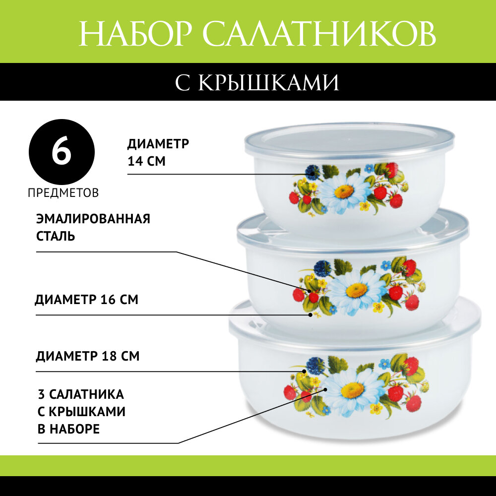 Набор эмалированных салатников с крышками, 6пр. (14/16/18см, 0,7/1,1/1,4л) "Леона"