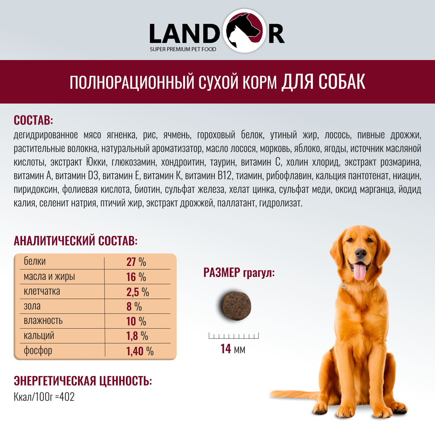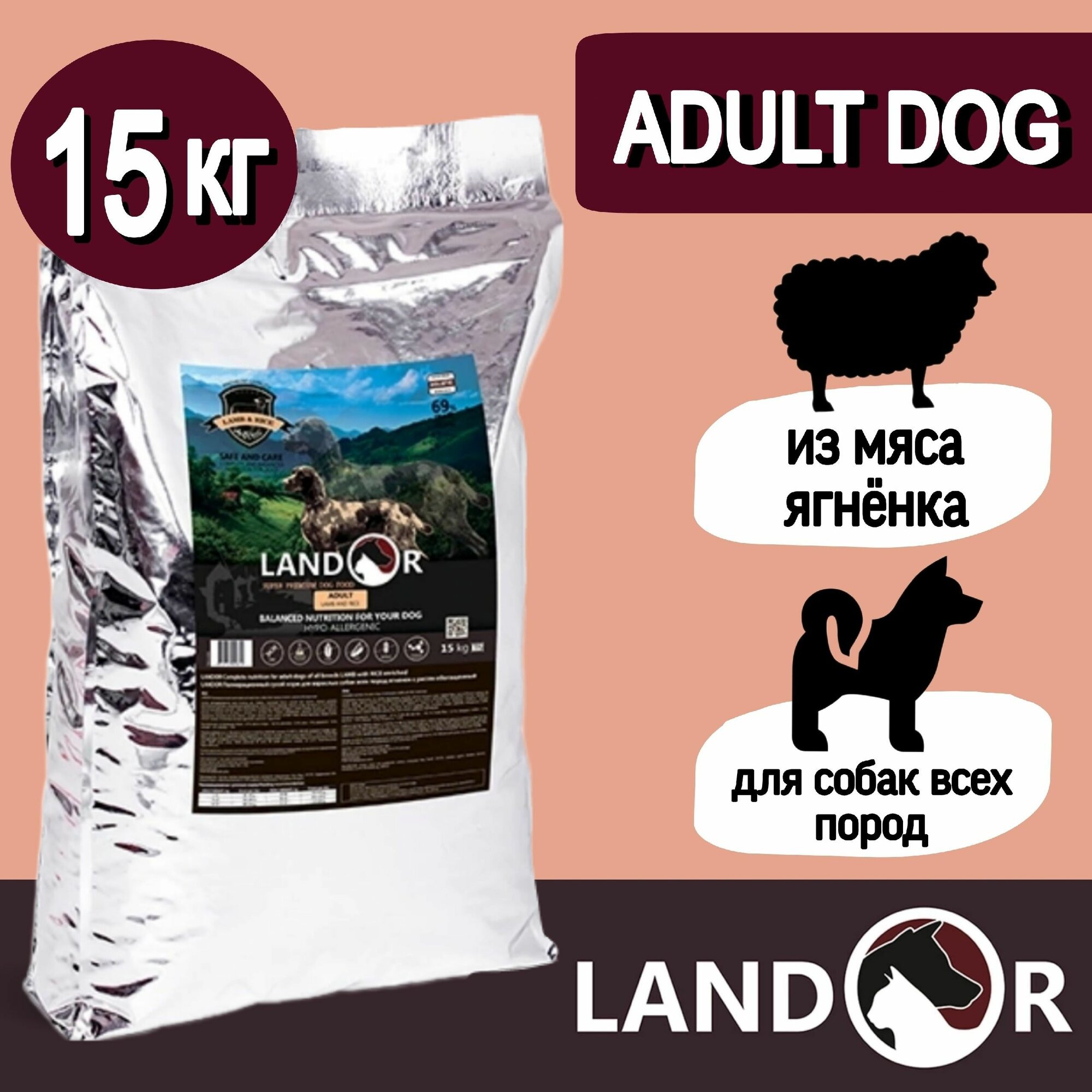 LANDOR DOG ADULT LAMB & RICE для взрослых собак всех пород с ягненком и рисом (15 кг)