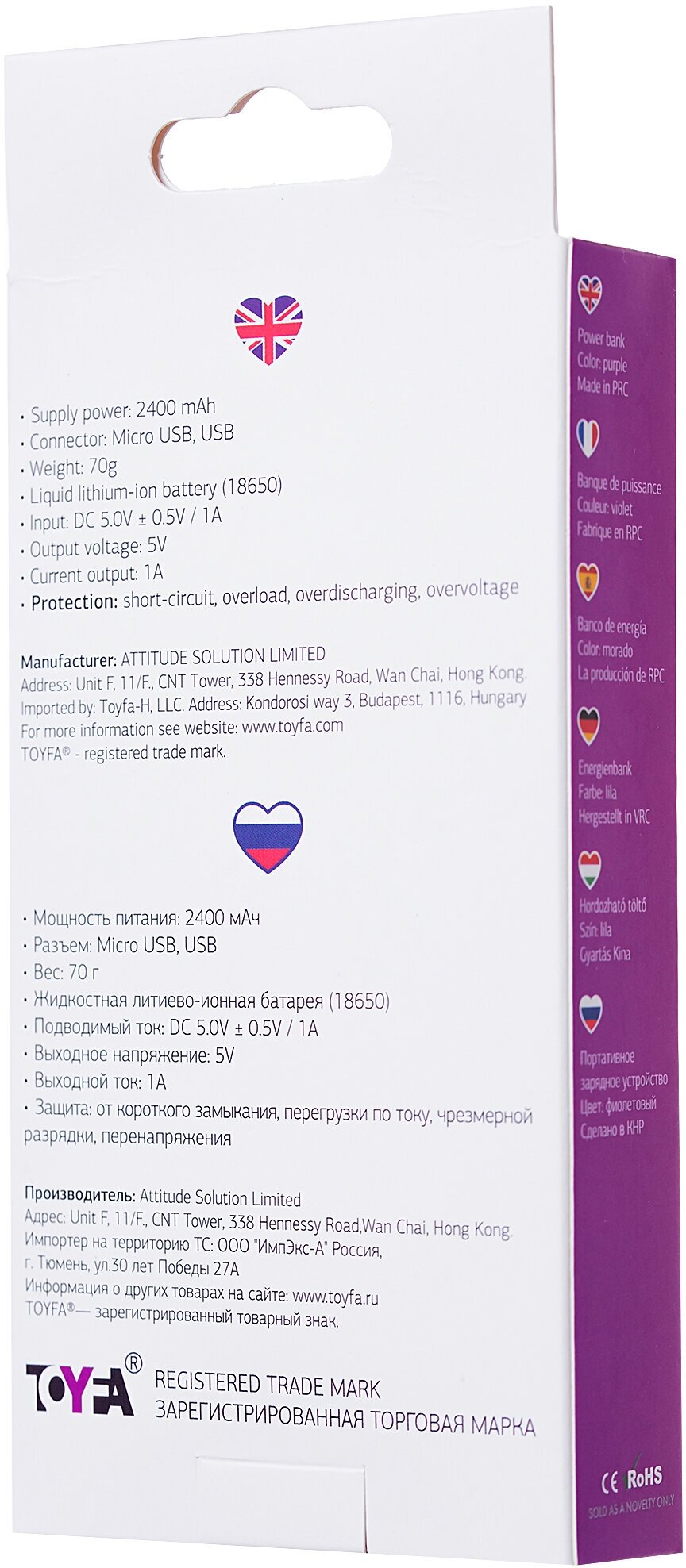 67983 ToyFa A-toys PowerBank 2400 mAh microUSB, фиолетовое. Портативное зарядное устройство