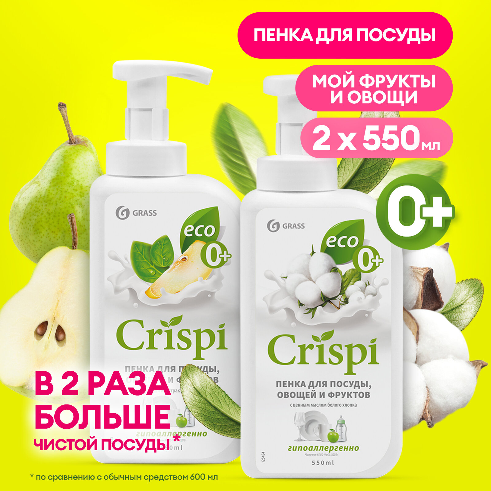 Средство для мытья посуды фруктов и овощей Grass CRISPI пенка 550 мл набор (2шт)
