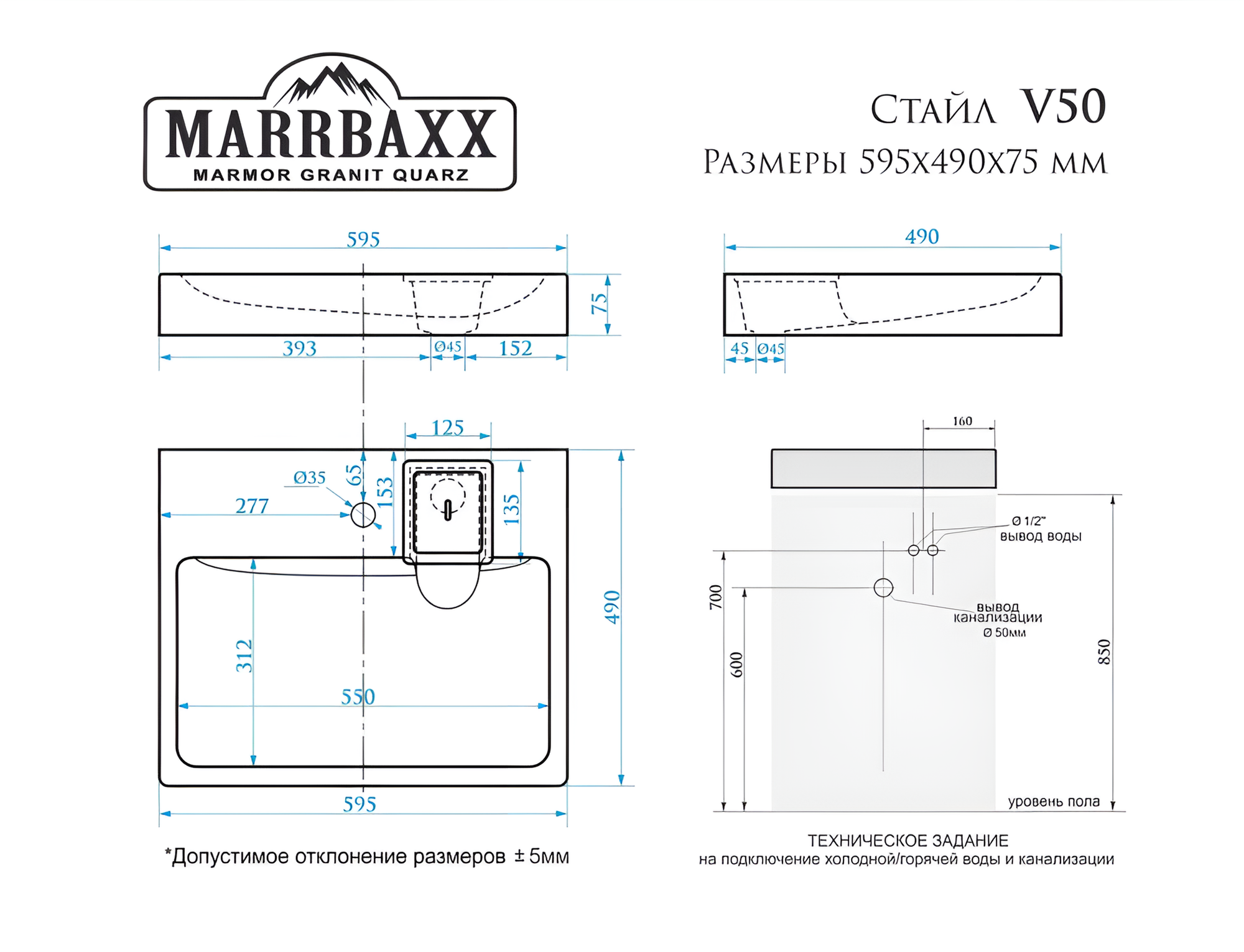 раковина над стиральной машиной MARRBAXX стайл V50D1 (с кронштейном V50) белая