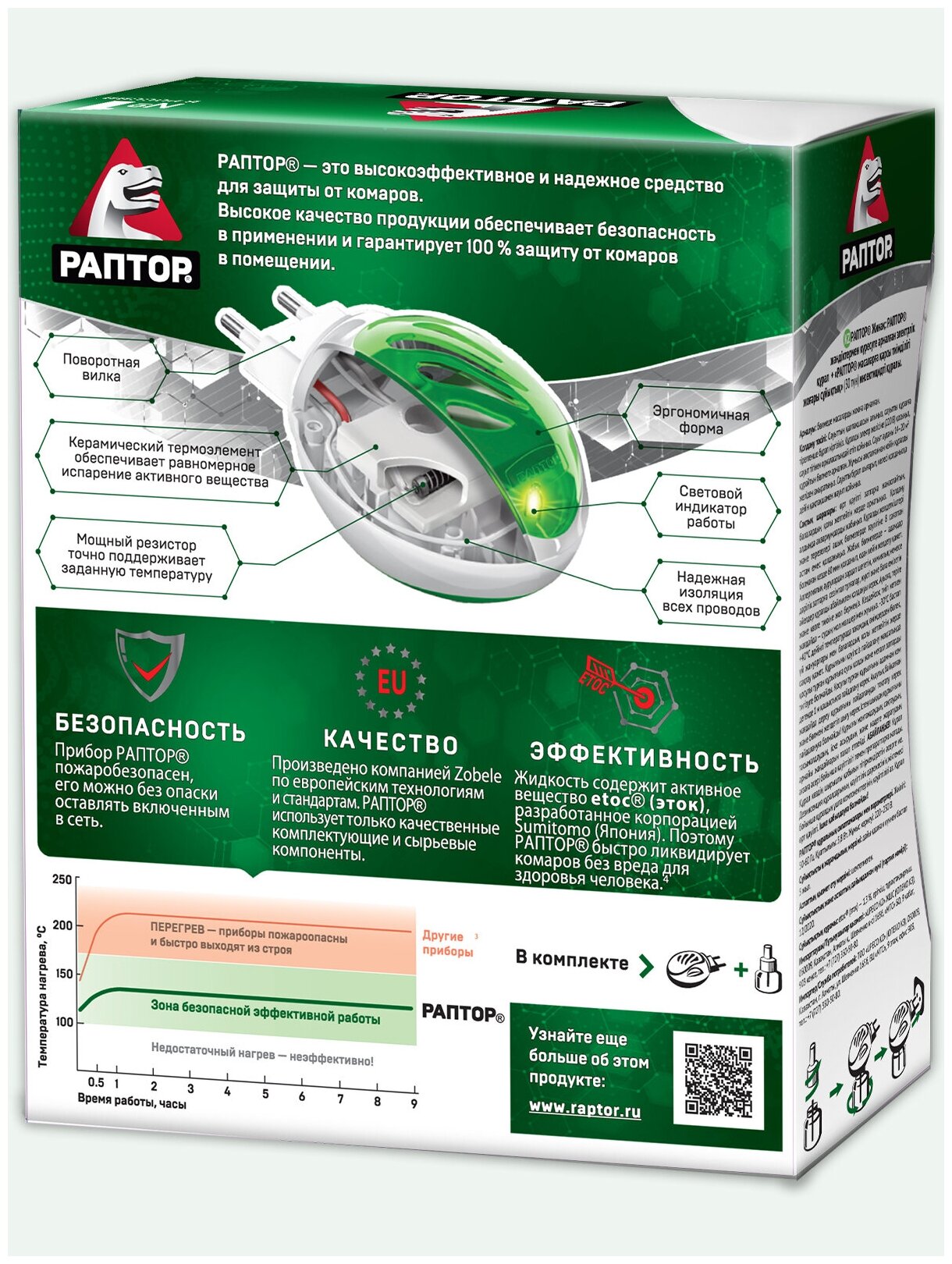 Комплект от комаров повышенной эффективности Раптор Mega Power, фумигатор и жидкость от комаров, 30 ночей