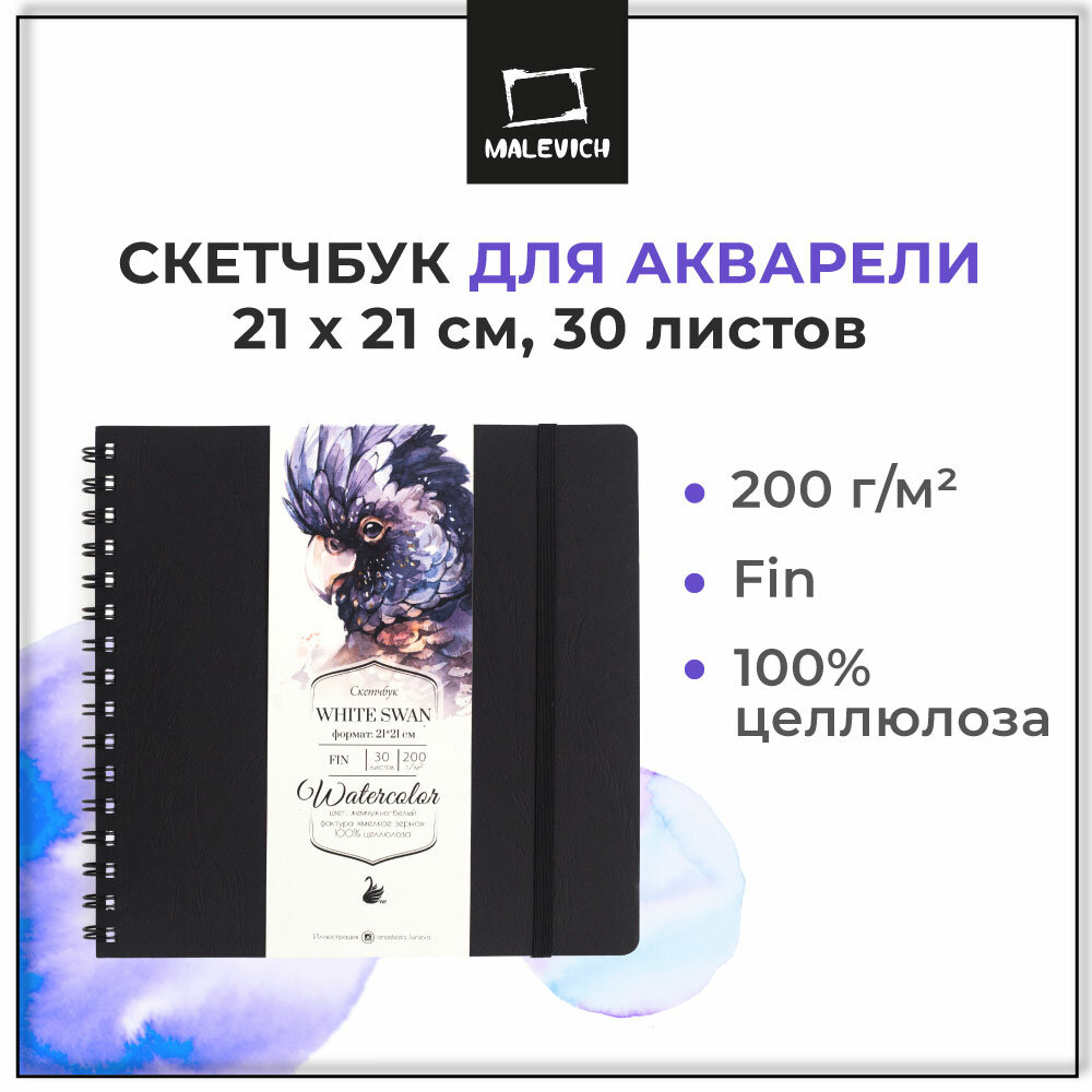 Бумага для акварели Малевичъ Скетчбук для акварели "White Swan" малевичъ, черный, Fin 200г/м2 21х21, 30л.