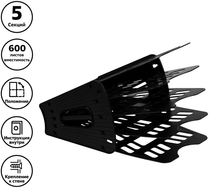 Лоток-веер для бумаг, 5 секций, 4 отделения, чёрный