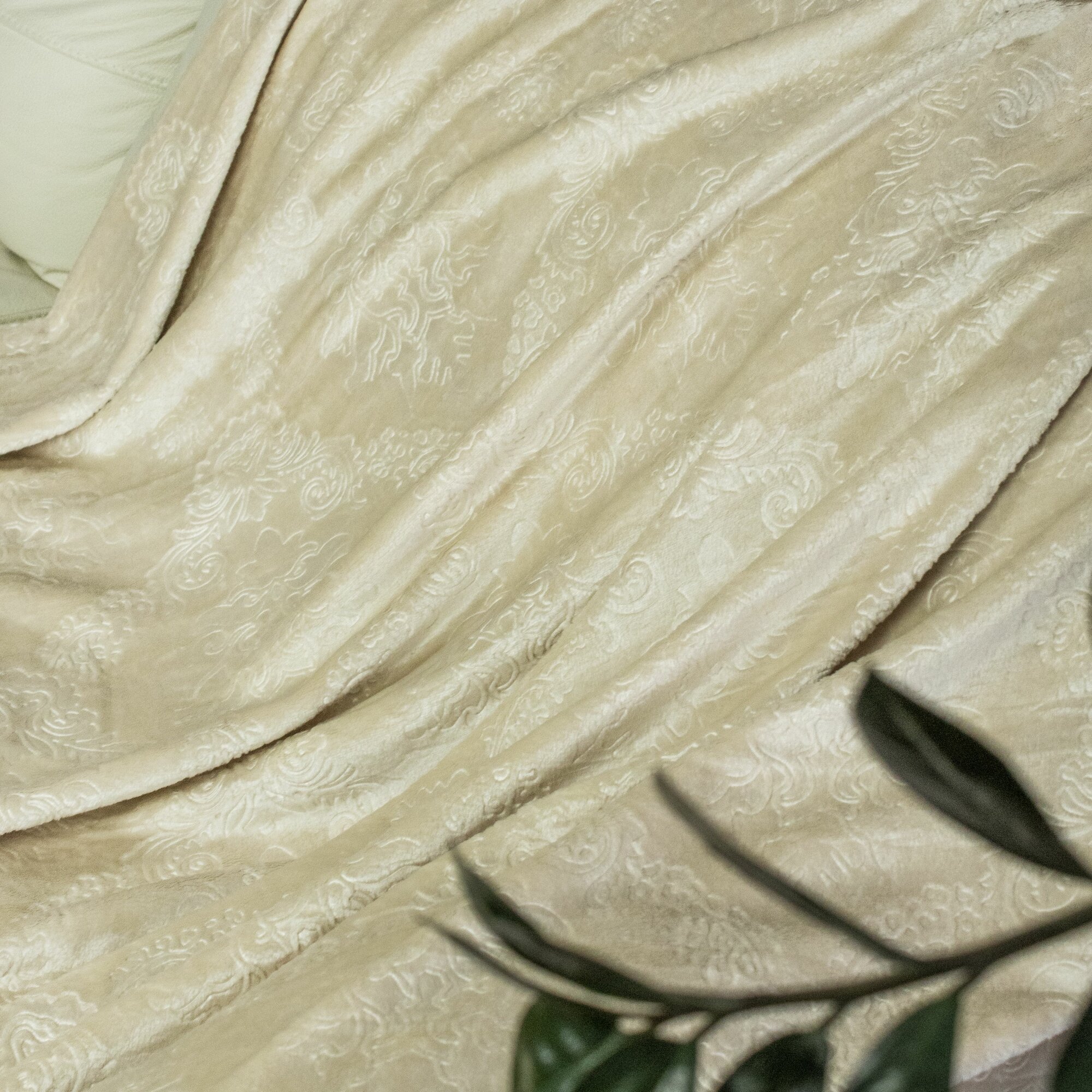 Плед полуторный 150х200 однотонный бежевый, покрывало на кровать и диван Cleo Parma, пушистый с узорами, флисовый, велсофт
