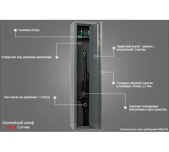 Оружейный сейф Onix Сотник на 1 ствол. Макс. высота ружья - 830 мм, 200х970х160 мм. Ключевой замок. Соответствует требованиям МВД РФ. интересное: