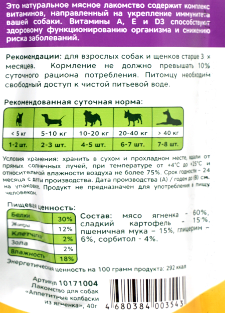 #(С)PT03/10171003 триол Аппетитные Колбаски из говядины для собак, 40гр 15%